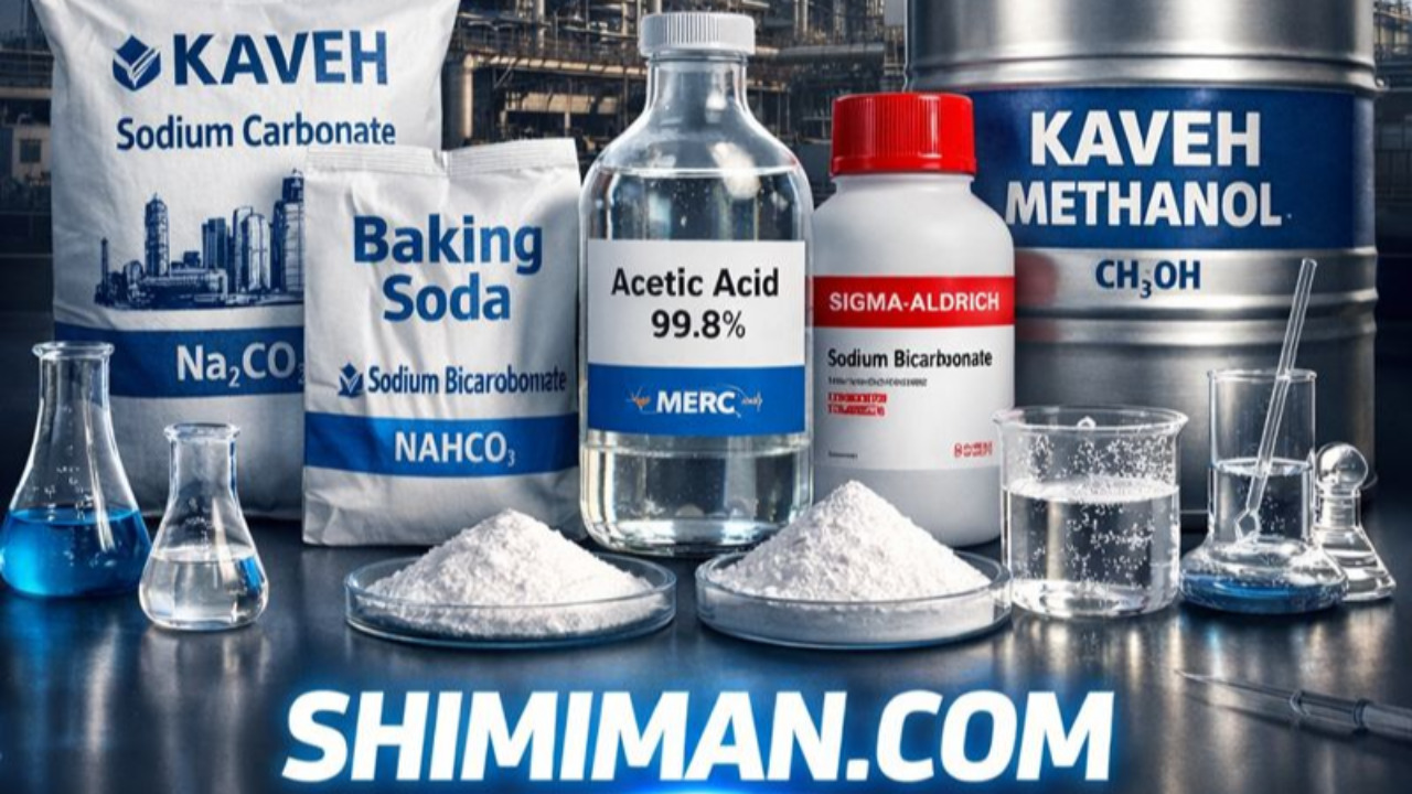اسید استیک شیمی من تصویر صنعتی مواد شیمیایی شامل متانول، کربنات سدیم، بی‌کربنات سدیم، جوش شیرین و اسید استیک به‌همراه برندهای معتبر Merck و Sigma-Aldrich